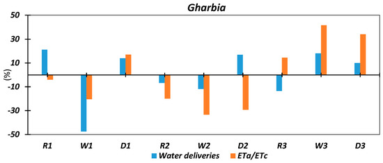 Gharbia (Figure 13): The relative changes in ETa/ETc and water deliveries had a similar magnitude in the 1st, 2nd and the third quarter of the wet year, in the 1st and 3rd quarter of the dry year and in the 2nd quarter of the reference. In the 2nd quarter of the dry year water deliveries were 16% higher than average, notwithstanding ET0-P being 30% lower than average with precipitation being 16% higher than average but concentrated in few days in February. This led to a 29% decrease in ETa/ETc.