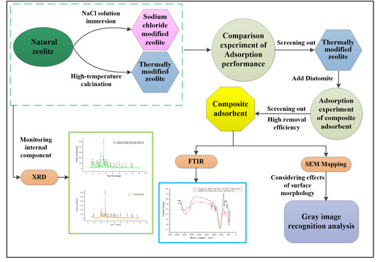 To achieve these targets, this paper is organised as follows: First, an analysis is presented based on the provided XRD data. XRD mainly observes the chemical composition inside an adsorbent. Then, the adsorption kinetics and isotherm experiments for natural zeolite, modified zeolite, and diatomite are performed in which an adsorbent is selected for high-efficiency removal of nitrogen and phosphorus and mixed into a composite adsorbent. Next, the optimal ratio of the composite adsorbent is determined by testing its adsorption properties. The composite adsorbent exhibiting the best adsorption performance is characterized by SEM, FT-IR, and SEM mapping. SEM is used mainly to observe the surface morphology of the adsorbent, FT-IR mainly measures the surface functional groups of the adsorbent, and SEM mapping characterization is mainly used to monitor the pollutant particles adsorbed on the surface of the adsorbent. Surface adsorption conditions were studied by using greyscale and surface gradient recognition, through which the surface configuration is evaluated, as shown in the research framework in Figure 1.