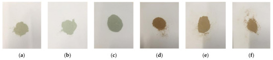 The composite adsorbent with improved physical and chemical properties was prepared as follows: First, the proper amount of distilled water was used to rinse green zeolite with impurities repeatedly. Then, the absorbent was placed in the oven at 105 °C to dry. After drying, the green zeolite was placed in a grinder and over a 200-mesh sieve to crush for 30 s. Then, green zeolite powder with particle sizes less than 0.075 mm was collected and stored in a clean beaker. Similarly, large particles of diatomite, from which impurities were removed, were placed in a large grinder and ground for 30 s through a 200-mesh sieve. Then, diatomite powder with particle sizes less than 0.075 mm was obtained, which was stored in a clean beaker for further use. Next, the pre-treated green zeolite powder in the crucible was weighed and placed in a muffle furnace with temperature adjusted and maintained at 350 °C. After 3 h, the calcined green zeolite powder was cooled to 25 °C to obtain thermally modified green zeolite and stored in a clean beaker for use. Third, a certain amount of sodium chloride solution with a concentration of 0.4 mol/L was prepared, then weighed green zeolite powder was mixed with this solution at a 1:50 ratio in a centrifuge at a speed of 50 rpm for 3 h. Next, the modified zeolite was removed and rinsed with distilled water repeatedly to remove excess Na+ and Cl−. Then it was placed in an oven at a temperature of 105 °C. After drying, the zeolite was stored in a clean beaker for further use. Then, through the screening experiment of the adsorbent, thermally modified zeolite was mixed with different ratios of 0.075 mm pre-treated diatomite powder. Finally, the composite adsorbent material was obtained. Figure 2 displays the features of natural green zeolite powder, sodium chloride modified green zeolite powder, thermally modified green zeolite powder and composite adsorbent powder.