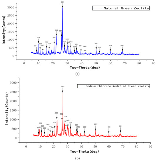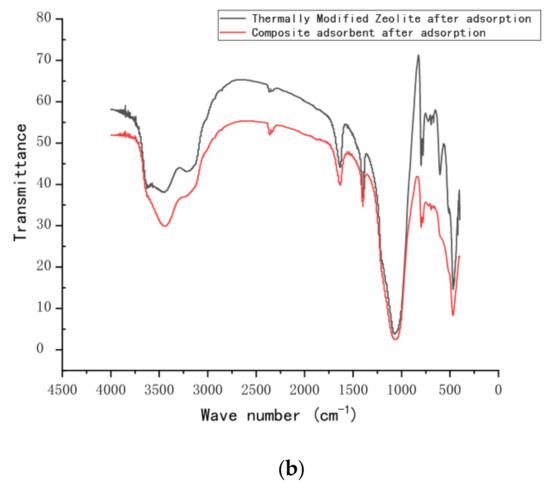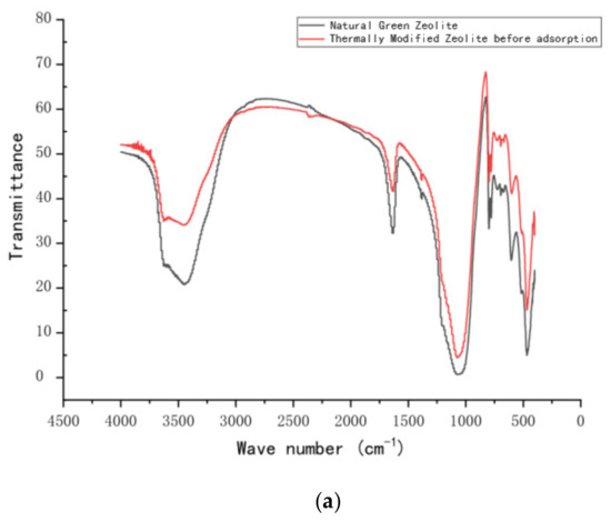 Fourier-transform infrared spectra were obtained using an FT-IR spectrophotometer (FT-IR, Nicolet iS10, American state of Massachusetts). The FT-IR spectra (Figure 10) displayed variations in functional groups on the surface of the zeolite before and after modification. They also show changes in the nitrogen functional group before and after adsorption. The infrared spectra of natural zeolite and calcined zeolite are shown in Figure 10a. The bending vibration peak appears at 564 cm−1, which was attributed to the vibration adsorption peak of Fe–O. The peak at 1568 cm−1 corresponds to the vibration peak of Al–O, and that at 1061 cm−1 can be matched with the vibration of the Si–O–Si skeleton. In addition, there is an adsorption peak of bound water at 3000–3500 cm−1, which corresponds to the antisymmetric vibration of the –OH group, and the maximum absorption peaks of zeolite and thermally modified zeolite are located at 3454 cm−1 and 3447 cm−1, respectively, mainly due to the difference in the bending vibration of combined water after the thermal modification of zeolite, consistent with previous studies [28,29]. The infrared spectra of calcined green zeolite and composite adsorbent after the respective adsorption (thermally modified green zeolite and diatomite at a ratio of 3:2) are shown in Figure 10b. Surprisingly, the absorption peaks of calcined green zeolite and composite adsorbent are located at 3150 cm−1 and 1400 cm−1, respectively, after the respective adsorption, which are N–H group vibration peaks, indicating that ammonia nitrogen was adsorbed into the internal pores of the zeolite molecular sieve.