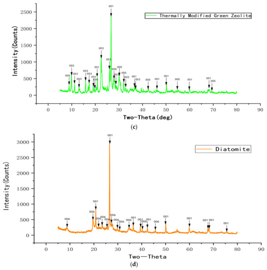 The XRD profiles of natural green zeolite powder (a), sodium chloride modified green zeolite powder (b), thermally modified green zeolite (c), and diatomite composite (d).