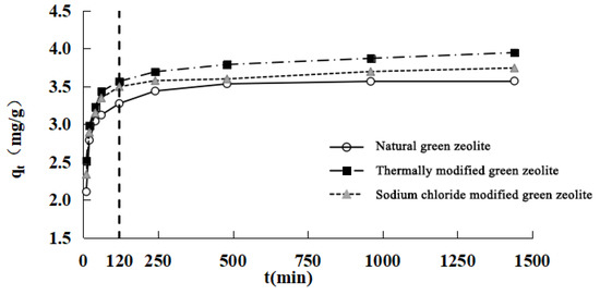 The nitrogen adsorption kinetics of modified green zeolite at different initial concentrations was investigated by varying the contact time, and the results are presented in Figure 4. It is evident that the adsorption process could be divided into two stages. First is the rapid stage, which occurs before 120 min. In this stage, the three types of zeolites exhibited the phenomenon of rapid adsorption, because the concentration of adsorbate was high at the initial stage of the adsorption process, and there were more available adsorbates for adsorption of the zeolites. Second is a gradually slower stage that occurs after 120 min, in which the adsorption equilibrium is achieved over time, and the adsorption rate was low compared with the initial stage of adsorption. This stage lasted longer, hence the phenomenon could be characterized as “fast adsorption, slow saturation.”