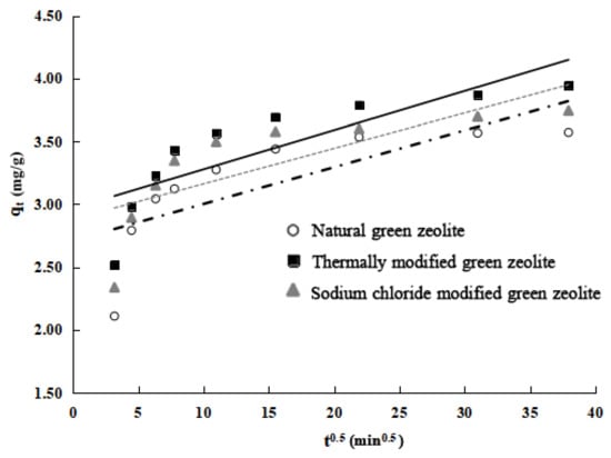 Figure 5 shows that the nitrogen adsorption process of the three types of zeolite can be roughly divided into three stages: first is the rapid external surface adsorption stage; second is the gradual adsorption stage, and intraparticle diffusion is the rate-limiting step of the process in this stage; and third is the final balanced stage. The fitting curve of the second stage clearly does not pass through the origin, which indicates that intraparticle diffusion is not the only rate-limiting step in the adsorption stage, and the rate-limiting step in the gradual adsorption stage includes both liquid film and intraparticle diffusion [21].