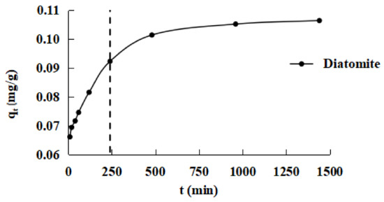 The phosphorus adsorption kinetics of diatomite are shown in Figure 6. The figure shows that the unit adsorption capacity of diatomite on phosphate gradually increases with the increased reaction time until an equilibrium is reached. It was shown that the adsorption process could also be divided into two parts: a rapid stage before 240 min, which may be due to the higher concentration of phosphorus during the initial adsorption stage, and the middle and later stages of the process after 240 min, in which the adsorbent gradually reaches saturation and the adsorption rate is lower, which is longer than that in the initial stage. This phenomenon can be characterized as “rapid adsorption, slow saturation.”