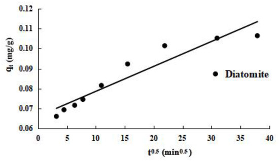 The intraparticle diffusion model is used to further study the process of diatomite kinetic adsorption. The experimental results are shown in Figure 7. From the curves of qt fit to t0.5 of diatomite adsorbed phosphorus in Figure 7, the adsorption of phosphorus can be roughly divided into three stages: first is rapid adsorption on the outside surface, second is gradual adsorption, and third is the final balancing. The fitting curve for stage 2 clearly does not pass through the origin, indicating that intraparticle diffusion is not the only rate-limiting step in the gradual adsorption phase of diatomite. Instead, the rate-limiting step includes liquid film and intraparticle diffusion.