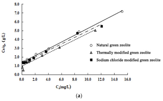 To clearly understand the surface properties and adsorption behaviour of the three types of zeolite, their adsorption onto nitrogen was investigated by fitting the experimental data with the Langmuir, Freundlich [22], and Dubinin–Radushkevich (D–R) [23] isotherm models. The models are shown in Figure 8a–c. The Langmuir model is based on the assumption that adsorption is localised on a monolayer and there is no interaction between the adsorbed pollutants; the Freundlich isotherm assumes that the process of adsorption occurs on a heterogeneous surface. The three isotherm equations are expressed as follows (Equations (6)–(8)):