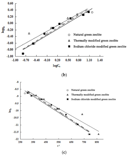 Isotherm adsorption model of three kind of zeolites onto nitrogen: (a) Langmuir model, (b) Freundlich model and (c) Dubinin–Radushkevich (D–R) model. Solid lines represent natural, dotted lines represent thermally modified and dashed lines represent NaCl modified green zeolite.