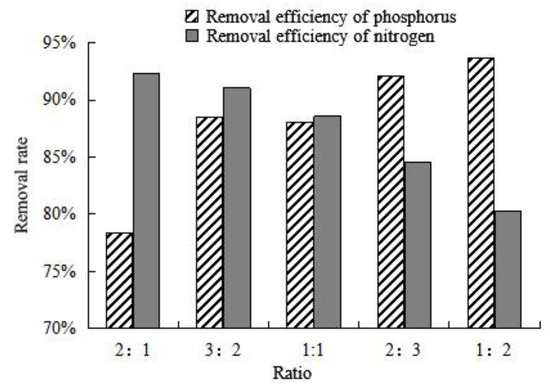 Column chart of adsorption efficiency of different proportions of thermally modified zeolite and diatomite on nitrogen and phosphorus.