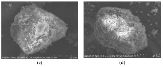 The surface morphology of the modified zeolite and diatomite is shown in Figure 11. It can be observed that the surface of the zeolite is relatively glossy and smooth. After recombination with a certain proportion of diatomite, the surface of composite adsorbent is newly covered with protrusions. Figure 11a shows a scanning electron micrograph of thermally modified green zeolite, which does not have a regular surface morphology, and there is little agglomeration. Figure 11b shows the SEM image of diatomite, with a microstructure composed of sheets of diatomaceous earth, irregularly arranged and partially overlapping. Figure 11c,d shows SEM images of thermally modified green zeolite and diatomite at the ratio of 3:2 and 2:3, respectively. Compared with the morphology of zeolite and diatomite, the structure of compound adsorbent is loose, forming a number of coral-like surface structures. Accompanied by a network of microporous structures, compound adsorbent is widely distributed, with a greatly increased specific surface area to improve the ability to adsorb ammonia nitrogen and phosphorus. Many studies have been done on Brunauer–Emmett–Teller (BET) [30]. The specific surface area of NaCl modified and thermally modified green zeolite was improved after modification to some extent. Our study is more focused on the surface adsorption mechanism of nitrogen and phosphorus, and the effect of BET was not considered.