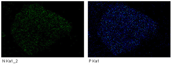The S-4800 x-ray energy spectrometer (SEM, Hitachi S-4800, Tokyo, Japan) was used to map the surface of composite adsorbent with a ratio of thermally modified zeolite to diatomite of 3:2. The mapping scan of the adsorbed elemental N and P is shown in Figure 12. According to the image display, the bright green and blue spots in the figure represent the adsorption of nitrogen and phosphorus on the surface of a composite adsorbent single particle with a ratio of thermally modified zeolite to diatomite of 3:2. The black area represents zero adsorption of nitrogen and phosphorus.