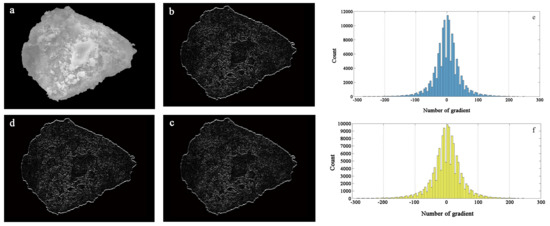 The gradient statistical histogram in the x- and y-directions reflects the range of the gradient distribution in each direction. The two directions are basically similar, and the distribution is primarily in the range of −150 to 150. The distribution is relatively scattered, and the numerical statistics are shown in Figure 13. It can be seen that the grey point gradient is more prominent in the range of −50 to 50, indicating that the surface of zeolite particles is irregularly changed, the relief becomes more uneven, and the surface morphology changes are significant.