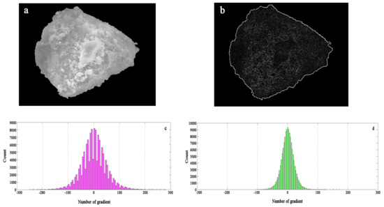 Laplacian transform is commonly used as a second-order derivative operator. For continuous function f(x,y), the Laplacian operator can be used to calculate the second-order derivative of the SEM image of the adsorbent. The second derivative histogram can be calculated by MATLAB (MathWorks, Natick, MA, USA). The Laplacian value is, for most pixels, near zero. Combined with the first derivative histogram, the degree of unevenness of the particle surface can be seen. The first-order derivative histogram can be used to detect the unevenness of the particle surface, indicating the roughness and complex appearance of the particle. SEM mapping, greyscale image recognition, and gradient recognition were used to compare the distribution of contaminants and the morphology of the adsorbent surface. The images of the second-order derivative characteristic map and the grey histogram are shown in Figure 14.
