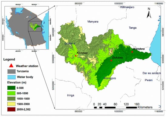 The Wami River Basin (Figure 1) is located between 5° to 7° S and 36° to 39° E. It covers the semi-arid areas in central Tanzania via the humid inland swamps in east-central Tanzania to the Indian Ocean and spans an area of 41,167 km2. The relief of the Wami River Basin ranges from sea level 2 m to 2370 m. The average rainfall in the basin ranges from 550 mm to 1000 mm per annum. There are two rainfall regions in the basin []: