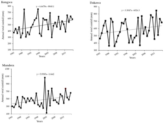 Rainfall is directly connected with global climate change and is subject to variability. Therefore, rainfall trend analysis at different temporal and spatial scales is a vital concern [,]. Worldwide climate change has evident wide-ranging impacts on natural resources, including freshwater ecosystems []. Its devastating impacts are agreed upon among researchers and policy-makers worldwide but the extent of exposure to different regions of the biosphere differs []. According to the Intergovernmental Panel on Climate Change (IPCC) Report [], the rural underprivileged in developing countries are the most exposed to the effects of climate change. Climate change will cause an intensification of rainfall variability, thus resulting in river flow fluctuations and a higher frequency of droughts or floods [,,,,,,]. The increased or decreased annual rainfall in various areas affects the annual and seasonal runoff and hence, water quality, water supply, and flood hazards [].