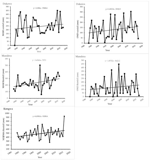 The 1983–2017 variation of total seasonal rainfall (in mm) recorded at Kongwa, Dakawa, and Mandera stations (NDJFMA—November–December–January–February–March–April; MAM—March–April–May; OND—October–November–December).