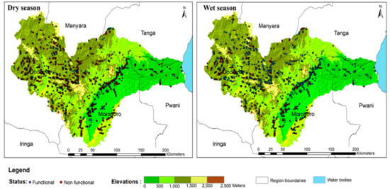 Spatial distribution of water points and their status during the dry season (August to September 2016) and wet season (March to April 2017) in the Wami River Basin.