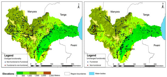 Waterpoint status was found to be substantially affected by seasonal changes (Figure 4 and Figure 5). The results show that 67% of the water points are not functioning during the dry season, while only 33% function. However, during the wet season, only 51% function, while 49% are not operating, with many water points changing from the non-functional during the dry season to functional during the wet season (Table 4). Additionally, 18% of the water points change from being functional to non-functional and vice versa, seasonally.