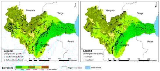 The results show that sufficient water is available at the water points during the wet season (Figure 6 and Figure 7), with a significant number of water points changing from providing an insufficient amount during the dry season to providing a sufficient amount during the wet season. Moreover, 67% of the population receive adequate water from water points, and 15% of the water points do not provide a sufficient amount, while 18% are dry. There is a significant decrease in the quantity of water available during the dry season, whereby 43% of the water points provide adequate water, while 39% of the water points provide an insufficient amount, and 18% are dry. Additionally, 24% of the water points change seasonally from providing a sufficient to an insufficient amount of water and vice versa (Table 5).