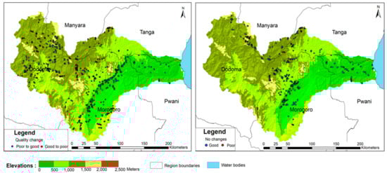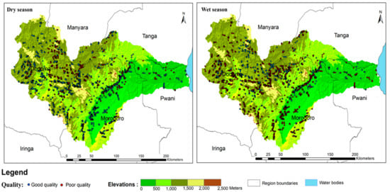 Data from the Water Point Mapping System (WPMS) (http://wpm.maji.go.tz/), which is managed by the Ministry of Water, Tanzania, were used to analyze the seasonal variation of water points in the Wami River Basin. The data were downloaded on August 2016. Information regarding three typologies of water points was selected. These include water point functionality, water quantity, and water quality. Only water points whose sources are from surface water were considered. Water point data exported from the WPMS to a spreadsheet were subsequently saved as a comma-separated value (CSV) file. During fieldwork in both the dry (August to September 2016) and wet seasons (March to April 2017), a total of 356 water points were verified. Then, an analysis of Water Point Mapping (WPM) data considering the aspects of water quality, water quantity, and status was performed using Quantum Geographical Information System (QGIS) software.