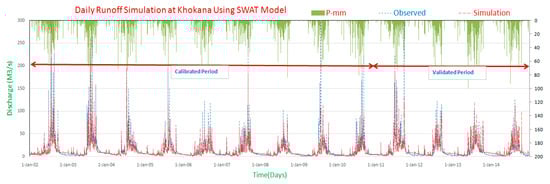 The SWAT model was set up, calibrated, and validated as described in Section 3. The model was calibrated for daily as well as monthly discharge at Khokana station in the Bagmati river. Model performance was evaluated by assessing hydrograph pattern as well as values of statistical parameters such as NSE, R2, and PBIAS. The observed and simulated daily hydrograph for calibration and validation periods are shown in Figure 4 and model performance indicators are depicted in Table 3.