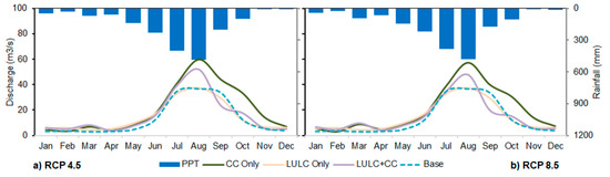 Most of the previous studies have focused either on impacts of LULC or climate change on hydrology/water resources. However, limited studies (e.g., [5,19,21]) have assessed impacts of both LULC and climate change. Other than Shrestha et al. [5], none of the studies have used projected future LULC data for assessing the impacts of both LULC and climate change. A study carried out by Shi et al. [21] in the Heihe river basin in northwest China showed that climate change, LULC change, and combined changes result in a change in river discharge by 107%, 7.3% and 3.2%, respectively. As the more realistic scenario is the one where both changes happen simultaneously, it is imperative to evaluate impacts of separate as well as combined impacts on hydrology.
