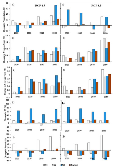 (a) Percentage change in precipitation for representative concentration pathway (RCP)4.5, (b) Percentage change in precipitation for RCP8.5, (c) Change in average Tmax for RCP4.5, (d) Change in average Tmax for RCP8.5, (e) Change in average Tmin for RCP4.5, (f) Change in average Tmin for RCP8.5, (g) Percentage change in evapotranspiration(ET) for RCP4.5, (h) Percentage change in evapotranspiration (ET) for RCP8.5, (i) Percentage change in runoff for RCP4.5, (j) Percentage change in runoff for RCP8.5 with respect to baseline data (2010) for climate and land use/cover.