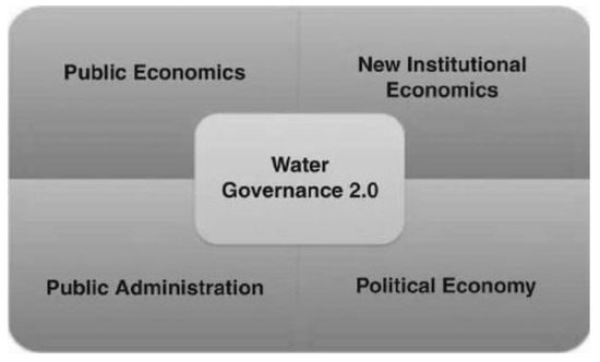 Despite the importance of water governance for the sustainable water supply and management, it is generally acknowledged that there is a lack of a theoretical approach with respect to the research in water governance. Franks and Cleaver [62] argued that there is a surprising lack of analysis based on solid theoretical foundations and core concepts of governance. The reasons could be taking governance only as a normative set of principles, as argued by McGranahan and Satterthwaite [83], or because many elements of water governance are also incorporated in other concepts such as integrated water resources management, human rights, participatory management, and partnerships [84]. Franks and Cleaver [62] argued that many elements of water governance are taken from practitioners, and are not subjected to critical academic analysis and debates. Araral and Yu [85] also argued that most of the research in water governance is devoid of theoretical coherence and analytical rigor, as most of the studies are descriptive and not grounded in empirics. To address these gaps, Araral and Wang [86] argued for a paradigm shift in the water governance research and called for a water governance 2.0 research agenda. According to the study, public economics, new institutional economics, political economy, and public administration will make the core of this new water governance 2.0 and associated research as represented in Figure 1.
