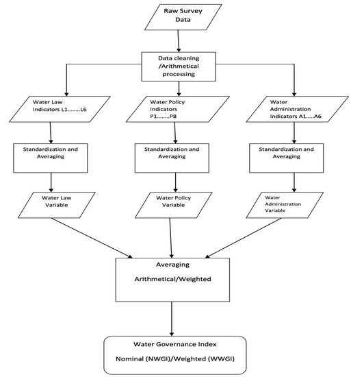 After getting average water law policies and administration scores, we average them again to get a nominal water governance index (NWGI). For the weighted water governance index (WWGI), we multiply these average law, policy, and administration scores with a relative weight of each variable in overall water governance. Our questionnaire also asks for a relative weight (out of 100) to be given to each of these three variables. We first average these weights across all the 152 survey responses. As our indicators scores are already standardized, we divide these weights by 100. Then, we multiply these weights with respective scores for water law, policies, and administration for each state. Then, we add the three numbers to get a water governance index (WGI) for each state. Figure 4 shows the complete methodology in the form of a flowchart.