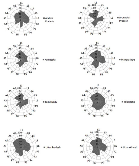 Scores for indicator P6 (linkage between water law and policy) also increased for most of the states between the old and the new survey, as shown by the mean values in Table 4. In the old survey, Uttar Pradesh had the maximum score of 61.3, and Telangana had the minimum score of 51. In the second survey, Maharashtra scored the maximum of 73.3, and Karnataka scored the minimum of 52.9. When scores are combined, Uttar Pradesh scored the maximum of 63.9, and Arunachal Pradesh scored the minimum, which is 55.8.
