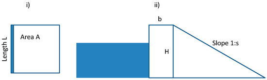 Schematic for river in flood plain and dam: i) The river runs along the side of a square representing the flood plain with area A. ii) Dam geometry with crest b, height H and slope 1:s.