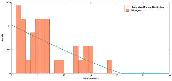 Fitting this distribution to the 35 extreme events in the original dataset, gives the values in Table 4. The histogram of the original events and the density function of the estimated generalized Pareto distribution are shown in Figure 2.