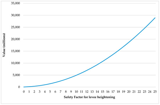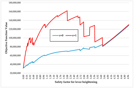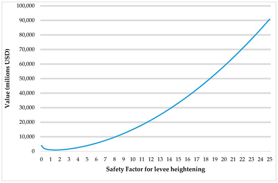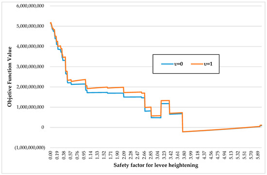 To investigate how the regimes might be affected by the choice of parameters, we examine the sensitivity of the results to a key parameter—the safety factor for levee heightening (. The safety factor is the proportional raising of defenses when a flooding events occurs, as presented in the Appendix Equation (A2). This safety factor in [1] is 1.1 for ‘technosociety’ and 0 for ‘greensociety’ (as no levees are present). Here we examine how the outcome for ‘technosociety’ is affected as a function of the safety factor for the high value and low value cases respectively (Figure 3 and Figure 4). It is interesting to observe the presence of multiple local minima and the non-smooth behavior which are both a reflection of the deterministic model. In the high value case (Figure 3) the optimal value for the safety factor of levee heightening is 3.76, much higher than the value of 1.1, which was established for the ‘technosociety’ in the original paper. In the low value case, the optimal value is zero, i.e., no levees are built (Figure 4).