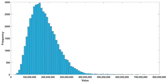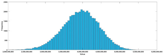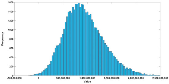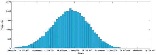 Each of the 50,000 paths is processed to obtain 50,000 values of the objective function at 1.1. The mean of these values is the expected present value under uncertainty, as all paths have the same probability. Figure 5 and Figure 6 present the high land value scenario for the ‘technosociety’ and ‘greensociety’ whereas Figure 7 and Figure 8 do the same for the low value scenario.
