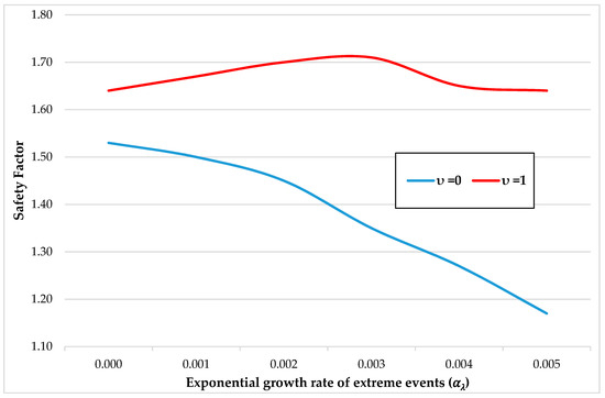 Table 7 shows that the optimal value of in the high land value scenario is 1.53 when υ = 0 and 1.64 when υ = 1 when assuming the generalized Pareto distribution. For the truncated GEV case the respective values are 1.17 and 1.24. Hence, the desired safety factor is not very sensitive to the value of υ. In the low land value scenario the desired safety factor is zero for both types of distribution.