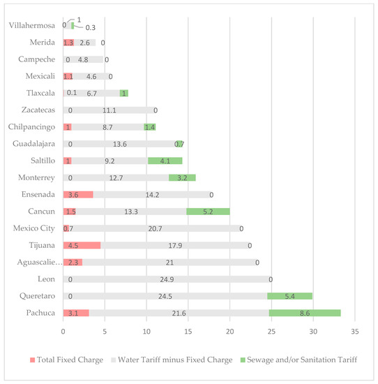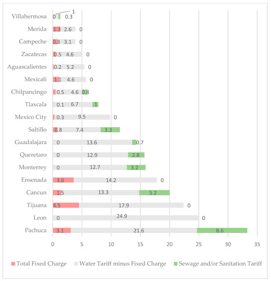 Drinking-water and sanitation tariffs for domestic use of popular type (or equivalent) in selected cities in Mexico, 2016 ($MX per cubic meter). Source: Authors’ elaboration with data from CONAGUA [23]; Note: Tariffs for a consumption of m3 per month.