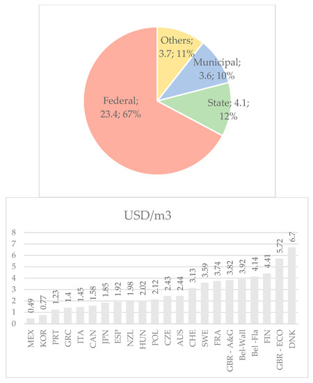 Significant investments are needed to maintain the required infrastructure to sustain the provision of water and sanitation services. In 2016, the total investments made in the water and sanitation sector were for 34,799 million pesos. Of these, 67 percent were financed by federal resources; 12 percent by state resources; 10 percent by municipal resources; and 11 percent by other sources, including state commissions’ investments, credits, and private sector (Figure 4) [23]. As mentioned earlier, private investment in the drinking water and sanitation sector is very limited and is mainly limited to construction-operation-transfer schemes for sewage treatment plants [23]. Hence, Mexico ranks the lowest in terms of water pricing for residential consumption against the OECD countries.