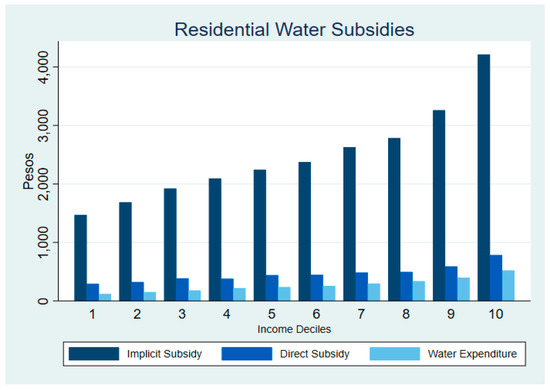 Residential water subsidies, 2014. Note: Implicit subsidy is accounted as the economic subsidy. Source: Own Calculations with data from ENIGH [25]; and PIGOO [27].