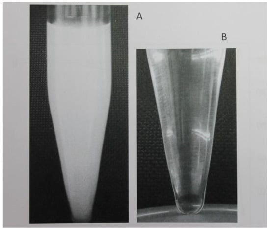 (A) Rapid formation of a dispersed phase, (B) deposited after centrifugation.