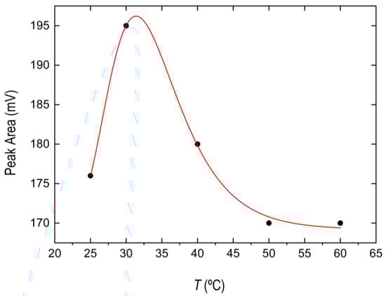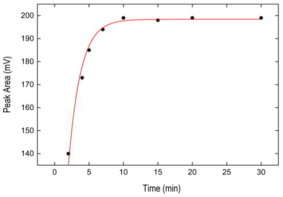 Incubation time of the samples was studied at 30 °C within the range of 2–30 min. As Figure 4 shows, the extraction performance of the BPA increased from 2 to 5 min, remaining constant for 30 min, becoming a fast technique that allows a wide working time range. Accordingly, we employed five minutes as heating time. The extraction kinetics was modeled via Equation (1) (red solid line in Figure 4), depicting C = 198.40 ± 1.93 mV, k = 0.57 ± 0.03 s−1 (R2 = 0.978).