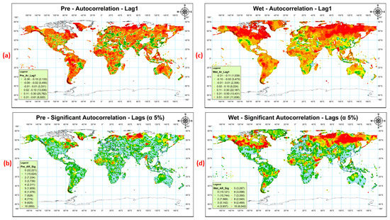 The lag1 autocorrelation, the significant autocorrelations up to lag10 at 5% significant level for Pre and Wet are shown in Figure 1a–d. Only a few of the regions showed significant negative autocorrelation. More than 60% of locations showed significant positive autocorrelation for precipitation, and out of them, almost 70% were found to be significantly autocorrelated up to lag2. Much more regions (>75%) indicated significant serial correlation for Wet data. Far Northern regions showed a higher order of serial correlation than the rest of the world.