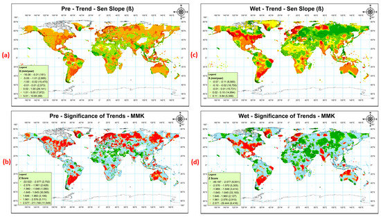 The ratio of trends, i.e., ßPre/ßWet, is shown in Figure 3a. Case-3 and 4 are presented by shades of green and red color, respectively. The regions with dark green color represent a higher rate of increase in Pre and moderate rate of decrease in Wet, suggesting an increase in the high-intensity precipitation events. The regions with the high increasing trend with moderate or low increasing Wet are shown by dark red color, indicating moderate to the high intensity of precipitation events. Most of the regions of Russia, Central Asia, and Southern Canada were found to be experiencing a higher intensity of Pre events and longer duration of the dry season.