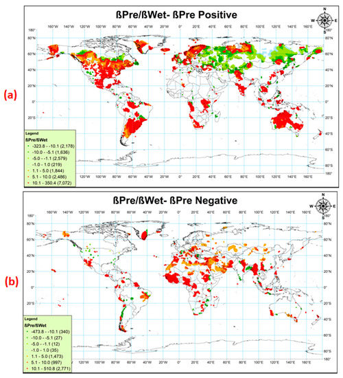 Relative change in trends of Pre with the trend of Wet. (a) Pre trend positive, (b) Pre trend negative. The value of ßPre/ßWet close to unity (indicated by light shades of green and red color) is assumed insignificant as it suggests a lesser amount of Pre trend than Wet. As represented in Figure 2a,c the magnitude of the ßWet is much lesser than ßPre, so the ßPre/ßWet close to unity (also lesser than unity) indicates very small Pre trend.