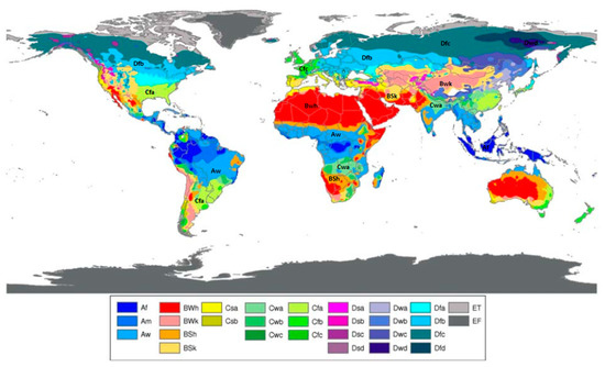 - Beck, H.E.; Zimmermann, N.E.; McVicar, T.R.; Vergopolan, N.; Berg, A.; Wood, E.F. Present and future köppen-geiger climate classification maps at 1-km resolution. Sci. Data 2018, 5, 180214. [Google Scholar] [CrossRef] [PubMed]