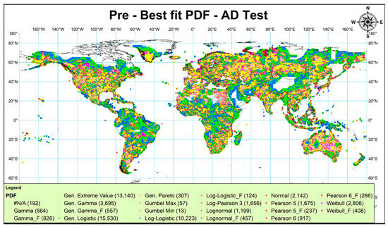 Three most popular goodness of fit (GoF) tests, i.e., AD, KS, and CS test, were applied to find the best-fit probability distributions. A significance level of 5% was adopted in this study for GoF tests. AD test is considered to be best a suitable GoF test because it gives more weights to the tails of the distribution [76]. CS test is not considered to be high power GoF test [77]. A summary of the percentage of precipitation data best fitted for a particular probability distribution is given in Table 2. Best-fit probability distributions for annual precipitation data for the landmass of the world is shown in Figure 5.