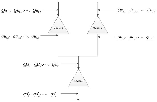 Assume that the dimensional space formed by the outflow of the upper reservoir 1 and reservoir 2, and the dimensional space formed by the inflow of the lower reservoir, are linear spaces, among which , , and . If the inflow of the lower reservoir in the current period is only related to the outflow of the upper reservoir in the current period and the outflow process in the first and periods, then the dynamic water flow hysteresis from the upper reservoir to the lower reservoir can be regarded as a mapping relation (), which can be simplified as: