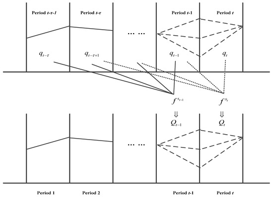 The existence of water flow hysteresis makes the solution of the short-term optimal operation model of cascade reservoirs a problem with an after-effect. Although the Progressive Optimal Algorithm (POA) can effectively deal with the after-effect problem [15], the traditional POA directly shifts the upper reservoir outflow in a single period and takes it as the lower reservoir inflow [23,24]. Here, the POA is coupled with the space mapping principle to develop an Improved Progressive Optimal Algorithm (IPOA) that can take into account the multi-period outflow of the upper reservoir. As shown in Figure 3, is the outflow of the upper reservoir in period and is the inflow of the lower reservoir in period . The outflow of the upper reservoir in period and the first periods are input into the mapping operator to obtain . The IPOA is conducted on Matlab.