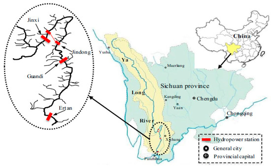 The Jinguan cascade reservoirs are located in the Yalong River basin in Sichuan province, which is composed of the Jinxi, Jindong, and Guandi reservoirs. The characteristic parameters of the Jindong and Guandi hydropower stations are listed in Table 1. The location of the Jinguan cascade reservoirs is displayed in Figure 4. The outflow of the Jinxi reservoir directly enters the Jindong reservoir, so the water flow hysteresis can be ignored. The water flow hysteresis in the Jinguan cascade reservoirs mainly happens in the process of the Jindong reservoir outflow reaching the Guandi reservoir. Therefore, for the convenience of research, only the Jindong and Guandi reservoirs were calculated and the interval inflow of Jiulong River was also considered.