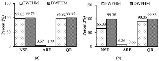 In Figure 5, it can be seen that, in different seasons, the calculated results of the DWFHM were better than those of the FWFHM. In the non-flood season, compared with the FWFHM, the NSE of the DWFHM increased by 1.88%, the ARE decreased by 2.32%, and the QR increased by 3.02%, indicating slight improvement by the DWFHM. In the flood season, compared with the FWFHM, the NSE of the DWFHM increased by 34.03%, the ARE decreased by 5.70%, and the QR increased by 9.80%, indicating significant improvment caused by the DWFHM.