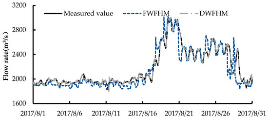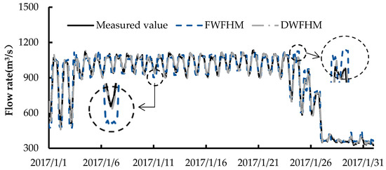 From Figure 6 and Figure 7 we can see that, in the non-flood season, when using the FWFHM, the calculation results were similar to the measured values. But at certain periods where the measured value was at its valley or peak, the result of the FWFHM was relatively small or large, because the FWFHM directly uses the sum of the upper reservoir outflow and interval outflow as the lower reservoir inflow, without considering the attenuation effect. Actually, after the river channel storage, the peak flow value will decrease and the valley flow value will increase. In the flood season, the deviation between the calculated results was larger than that in the non-flood season. This was reflected in two aspects: (1) The calculated value of the FWFHM was larger than the measured flow; (2) The time deviation at peak and valley was also large.