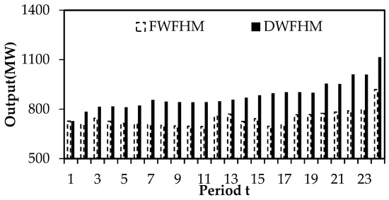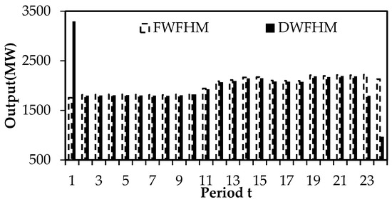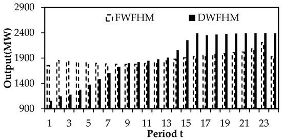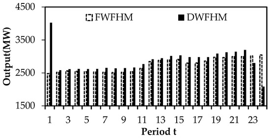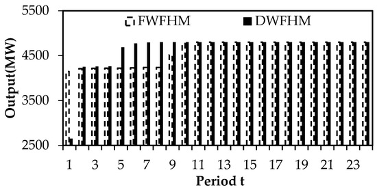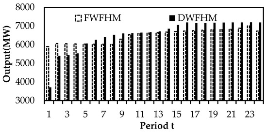 From Table 2 it can be seen that, in the typical day of the non-flood season, the total generated energy of Scheme 2, compared with Scheme 1, increased by 1640 MW·h. This is because the deviation between the inflow calculated by the FWFHM and the actual operation process was reduced in Scheme 2. Compared with Scheme 1, the total generated energy of Scheme 3 increased by 1187 MW·h. This is because the FWFHM only considers the influence of single-period flow while the DWFHM takes into account the influence of multi-period flow on the inflow of the Guandi reservoir in the current period. It can be seen from Figure 8, Figure 9 and Figure 10 that at the beginning of the cycle, by increasing the outflow of the Jindong reservoir, the output of the Jindong hydropower station was increased, the water level of the Guandi reservoir was raised, and the output of Guandi hydropower station was increased. Without considering the output constraint, the Jindong reservoir increased its output in period 1 to raise the water level of the Guandi reservoir. Although the overall generated energy decreased by 464 MW·h in the operation cycle of the Jindong reservoir, the generated energy of the Guandi reservoir in the later period was increased by 1650 MW·h, thus increasing the total generated energy in the operation period of the cascade reservoirs by 1186 MW·h. In addition, compared with the FWFHM, the actual operation results of the DWFHM increased by 2827 MW·h.